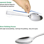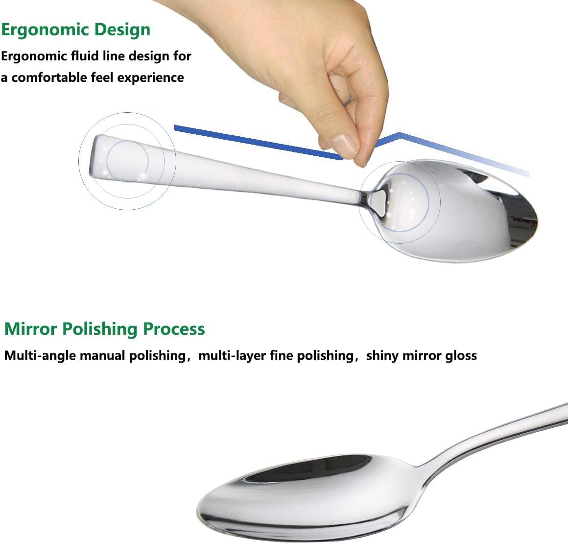 - 【HIGH QUALITY AND DURABLE】: Our cutlery set are made of top food grade stainless steel with mirror finish, providing you with a durable kitchen spoon set that will last you many years. Their edges have been polished many times and are smooth that they won't scratch your mouth. They are resistant to rust, corrosion and dishwasher safe. It's a great alternative to the plastic spoons.